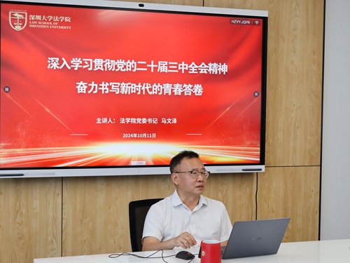 20241011日下午,法学院党委书记马文泽以“深入学习贯彻党的二十届三中全会精神,奋力书写新时代青春答卷为主题,在明律楼417会议室为同学们讲授思政第一课,2024级新生代表参加本次学习